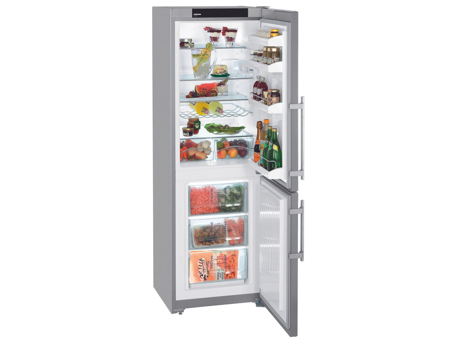 Het half deelbare glasplateau biedt extra flexibiliteit voor hogere verpakkingen of schalen. Alle plateaus, met edelstalen sierlijst aan de voorzijde en afneembare kunststof achterstrip, kunnen bijzonder gemakkelijk in vele hoogtes worden versteld. Uitnemen en reinigen is dankzij de ingenieuze constructie van de binnenkuip een koud kunstje.